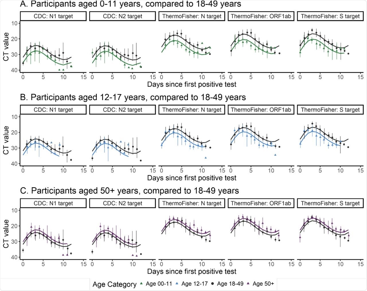The study findings confirm that children and adolescents have a lower viral load than adults, while older adults have higher median Ct values. The findings apply mostly to the variants circulating before the Alpha variant emerged but corroborate earlier studies showing that PCR values shift with the type of assay and timepoint during infection. Some earlier studies have also shown that Ct values are lower in children under 5 as compared to older children; however, this difference requires further research.