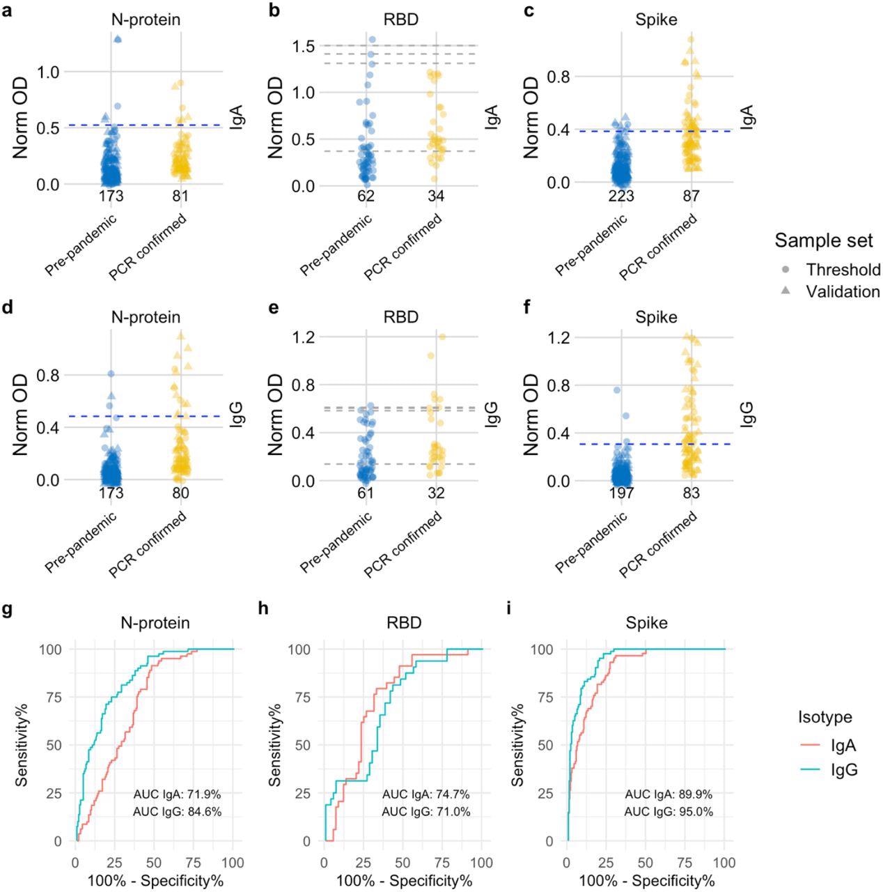 Distribution of semi-quantitative titres for each assay and corresponding ROC curves. a-c, Dotplots show the scatter of values for SARS-CoV-2 specific IgA responses and specific IgG responses in d-f. Data are presented for known negative and known positive samples, the number of samples tested in each group is shown under the corresponding data points. For N-protein and Spike, proposed thresholds (97th – 99th percentile and Youden’s index) are shown as dashed lines, with the final selected threshold in blue; thresholds were derived in the threshold setting phase (threshold samples shown as circles, validation samples shown as triangles). RBD was not taken forward to full evaluation, so performance in the threshold set and corresponding proposed thresholds are shown as dashed grey lines. g, i, ROC curves for N-protein and Spike represent assay performance determined on all threshold and validation set samples combined. h, The ROC curve for RBD represents assay performance in threshold sample set. ROC = receiver operating characteristic. AUC = area under the curve. Norm OD = Normalised OD (a relative ratio to the serum standard). N-protein = Nucleocapsid protein. RBD = Receptor binding domain.