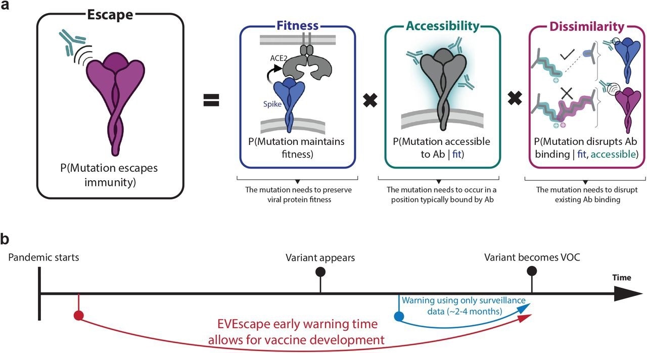 EVEscape assesses the likelihood of a mutation to escape immune response based on the probabilities of a given mutation to maintain viral fitness, to occur in an antibody epitope, and to disrupt antibody binding, using information available early in a pandemic. EVEscape assesses the likelihood of a mutation to escape immune response based on the probabilities of a given mutation to maintain viral fitness, to occur in an antibody epitope, and to disrupt antibody binding, using information available early in a pandemic.
