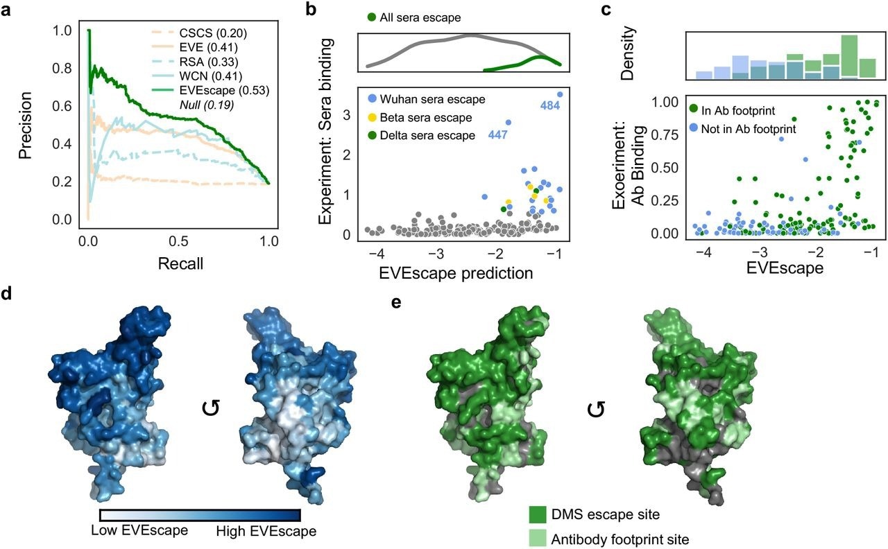 EVEscape captures antibody footprints and escape potential. a) Precision-Recall of RBD DMS escape mutations (AUPRC reported compared to “null” model). b) EVEscape captures mutations that effect recognition by convalescent sera from patients infected with different VOCs. c) RBD site-averaged EVEscape predictions plotted against site-averaged Bloom DMS escape, with hue indicating known antibody footprints. d) RBD site-averaged EVEscape predictions (PDB: 7BNN). e) RBD sites of DMS escape mutants and of known antibody footprints (PDB: 7BNN). EVEscape captures antibody footprints and escape potential. a) Precision-Recall of RBD DMS escape mutations (AUPRC reported compared to “null” model). b) EVEscape captures mutations that effect recognition by convalescent sera from patients infected with different VOCs. c) RBD site-averaged EVEscape predictions plotted against site-averaged Bloom DMS escape, with hue indicating known antibody footprints. d) RBD site-averaged EVEscape predictions (PDB: 7BNN). e) RBD sites of DMS escape mutants and of known antibody footprints (PDB: 7BNN).