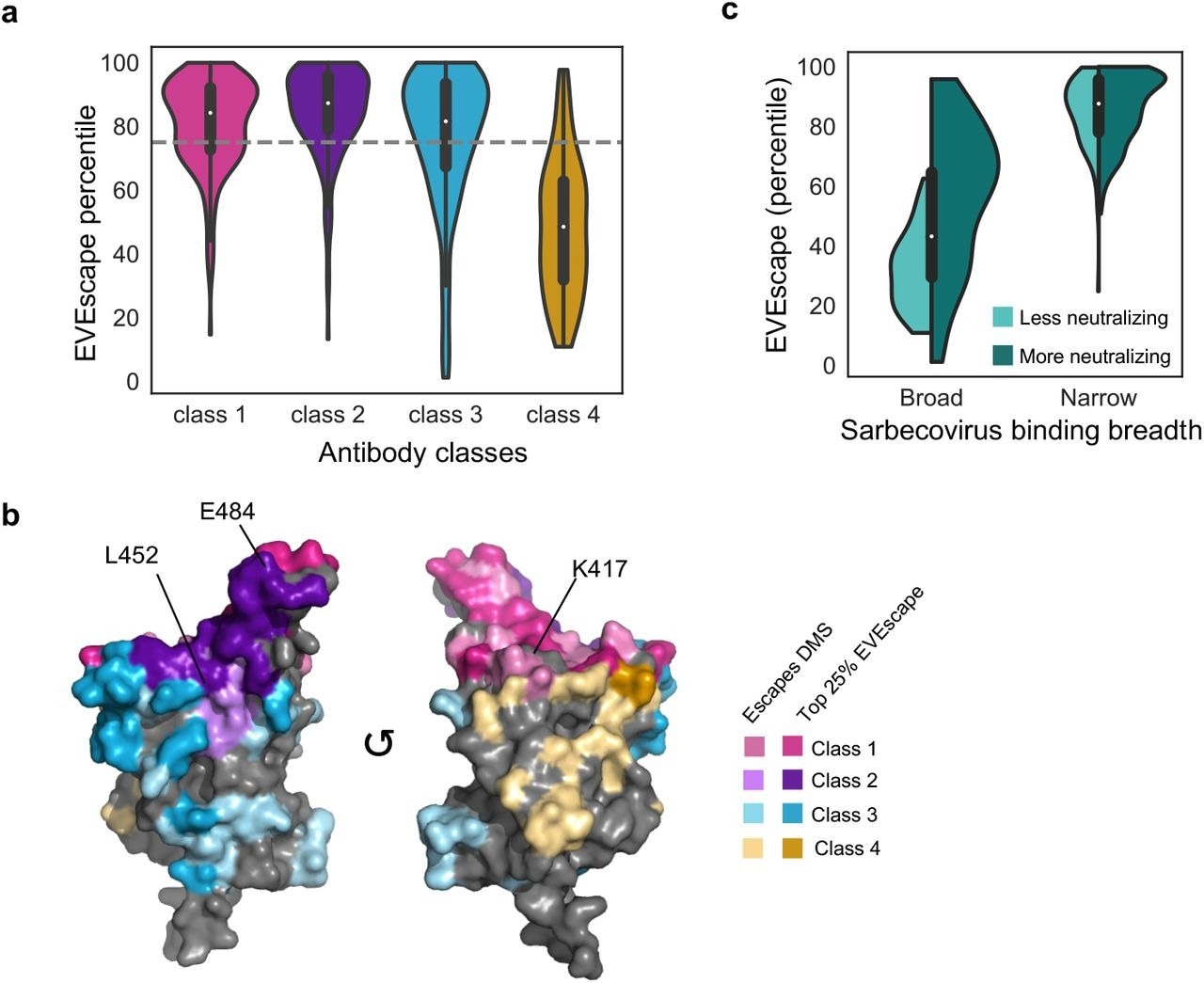 EVEscape predictions identify escape-resistant classes of antibodies. a-b) EVEscape scores of observed escape mutations cover diverse epitope regions across antibody classes including known immunodominant sites (E484, K417, L452) (PDB: 7BNN). c) EVEscape scores observed escape mutants from narrow antibodies and broad neutralizing antibodies higher than those from broad, non-neutralizing antibodies. Miniature boxplots within violin plots indicate median and interquartile range. EVEscape predictions identify escape-resistant classes of antibodies. a-b) EVEscape scores of observed escape mutations cover diverse epitope regions across antibody classes including known immunodominant sites (E484, K417, L452) (PDB: 7BNN). c) EVEscape scores observed escape mutants from narrow antibodies and broad neutralizing antibodies higher than those from broad, non-neutralizing antibodies. Miniature boxplots within violin plots indicate median and interquartile range.