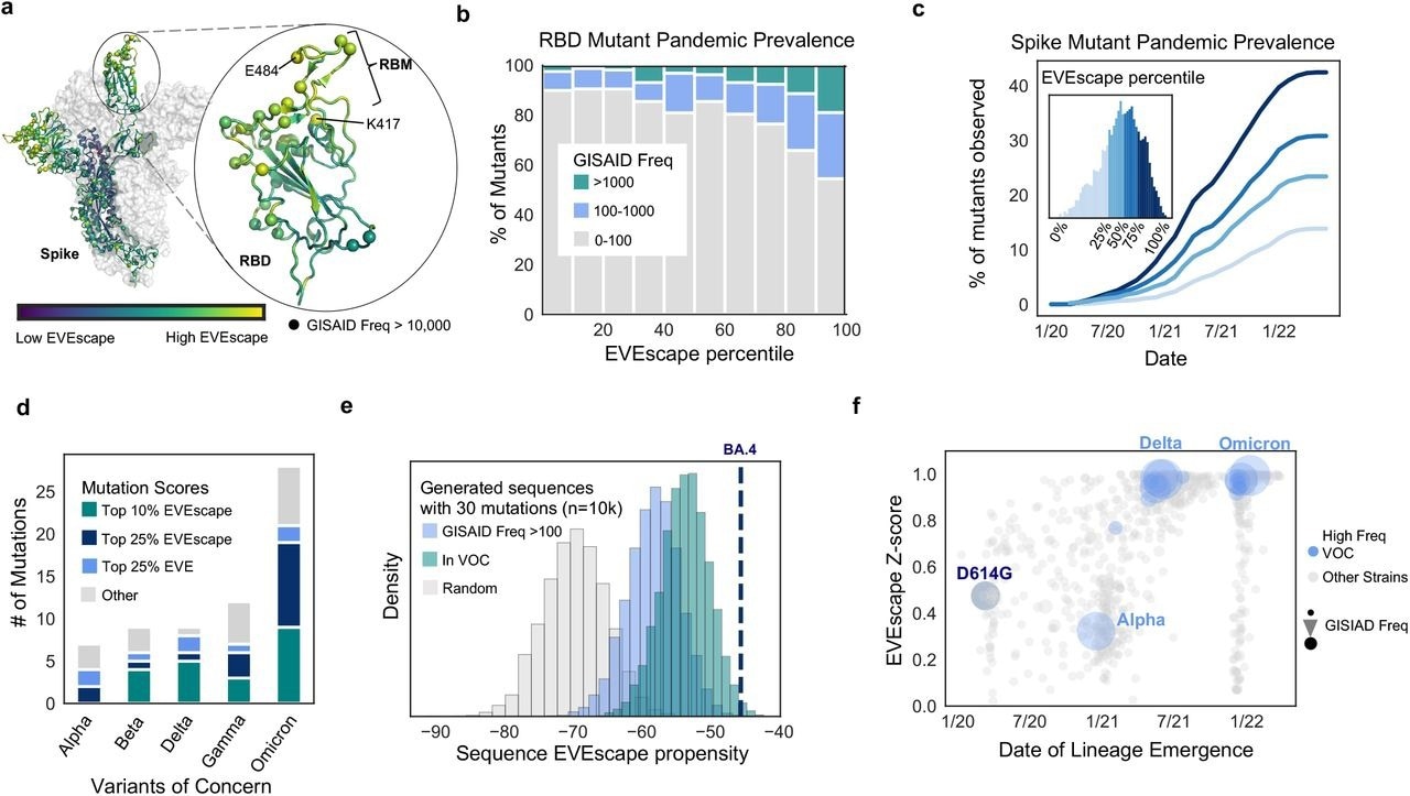 EVEscape anticipates single mutations and strains observed in the SARS-CoV-2 pandemic. a) Site-averaged EVEscape scores on Spike structure (PDB: 7BNN) depict regions of high EVEscape scores (RB D, particularly the ACE2 binding region (RBM), and NTD). Spheres indicate sites with GISAID mutations observed more than 10K times. b) EVEscape mutation scores correspond to observed GISAID mutations in the RBD. c) Percentage of mutations in each EVEscape quartile seen >100 times in GISAID over time d) The majority of mutations in VOC strains are in the top quartile of Spike EVEscape predictions. e) BA.4 has a high EVEscape score compared to random samples of mutations at the same mutation depth. f) EVEscape z-scores increase throughout the pandemic, particularly for VOCs. Z-scores are relative to random combinations at the same mutation depth of single mutations seen over 1000 times in (GISAID. Note: EVEscape percentiles have been adjusted to consider only mutations that are a nucleotide distance of one away from Wuhan. EVEscape anticipates single mutations and strains observed in the SARS-CoV-2 pandemic. a) Site-averaged EVEscape scores on Spike structure (PDB: 7BNN) depict regions of high EVEscape scores (RB D, particularly the ACE2 binding region (RBM), and NTD). Spheres indicate sites with GISAID mutations observed more than 10K times. b) EVEscape mutation scores correspond to observed GISAID mutations in the RBD. c) Percentage of mutations in each EVEscape quartile seen >100 times in GISAID over time d) The majority of mutations in VOC strains are in the top quartile of Spike EVEscape predictions. e) BA.4 has a high EVEscape score compared to random samples of mutations at the same mutation depth. f) EVEscape z-scores increase throughout the pandemic, particularly for VOCs. Z-scores are relative to random combinations at the same mutation depth of single mutations seen over 1000 times in (GISAID. Note: EVEscape percentiles have been adjusted to consider only mutations that are a nucleotide distance of one away from Wuhan.