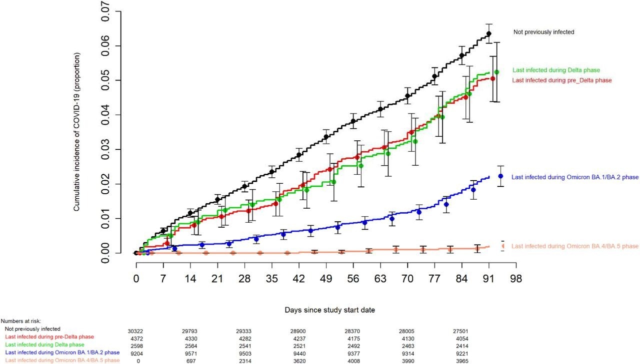The risk of COVID-19 was lowest for those infected when the Omicron BA.4/BA.5 variant was the dominant circulating strain. However, the risk of being infected with SARS-CoV-2 was higher for those who received more vaccines.