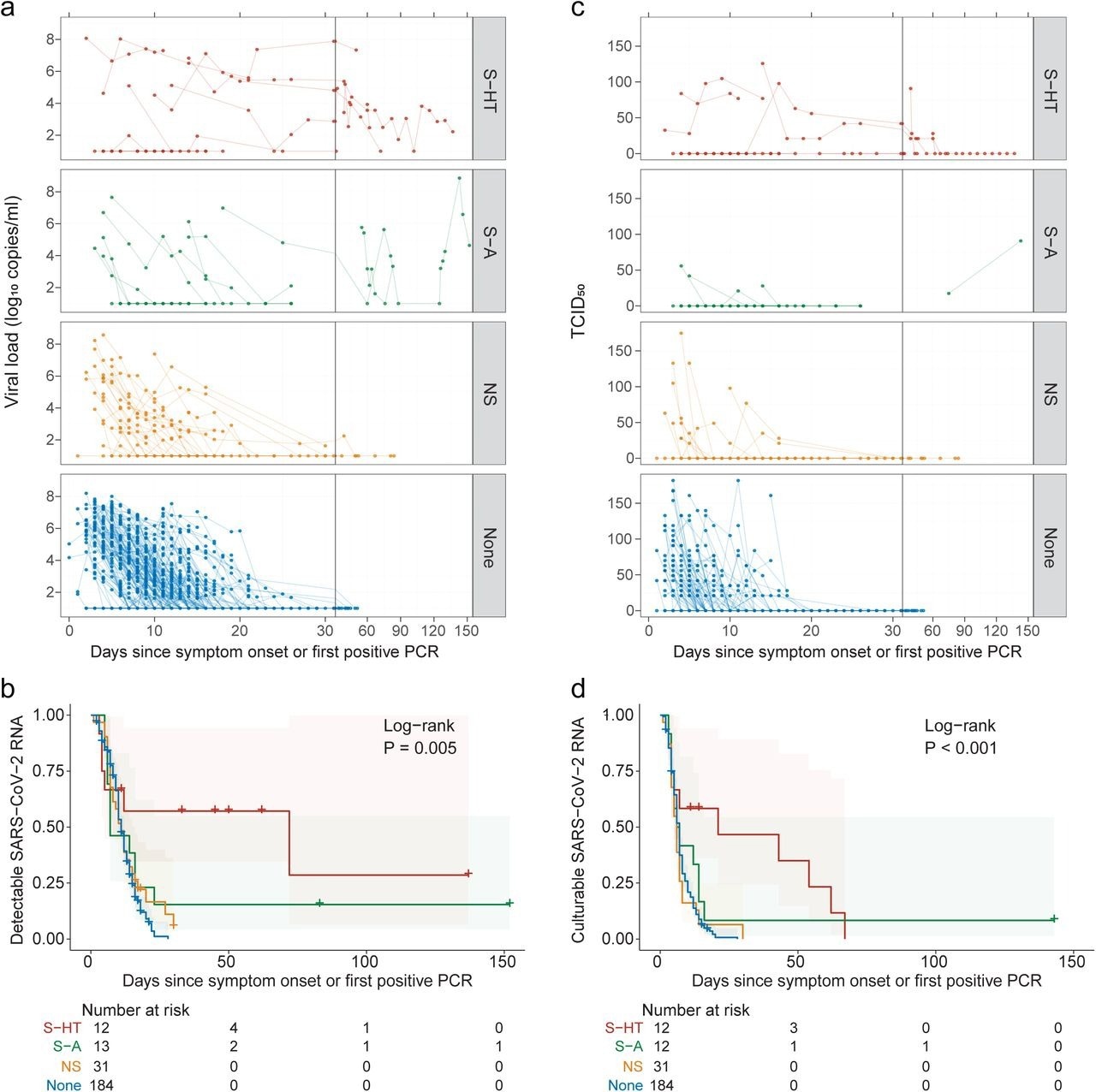 The median duration for nasal SARS-CoV-2 RNA clearance by S-HT individuals was 72 days, which was significantly longer than those by S-A, NS, and non-immunosuppressed individuals at seven, 11, and 11 days, respectively. Likewise, S-HT individuals exhibited significantly delayed culturable SARS-CoV-2 clearance at 21 days as compared to 6.5, six, and seven days for S-A, NS, and non-immunosuppressed individuals, respectively.
