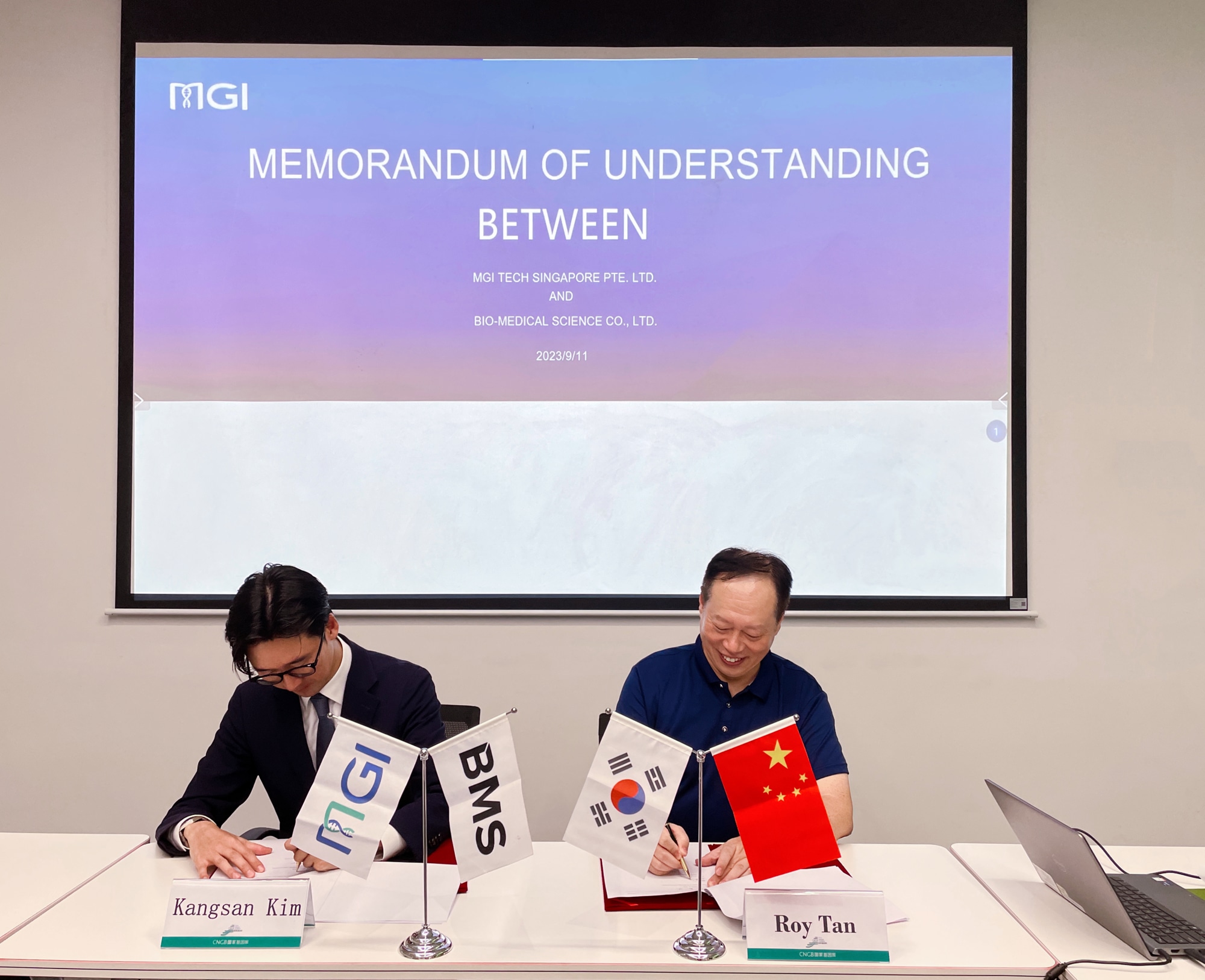 Cheonan, South Korea, 14 September 2023 – MGI, a company committed to building core tools and technology to lead life science, today announced MOU with Bio-Medical Science Co., Ltd. ("BMS") to expand genomics solutions in South Korea by leveraging MGI's cutting-edge technology. The MOU is expected to reach collaborations in localizing MGI's manufacturing capability in selected genetic sequencers and reagents in South Korea via BMS, which will provide the market with state-of-the-art products that have been adapted to local needs, thereby helping advance genomic research and clinical diagnostics.