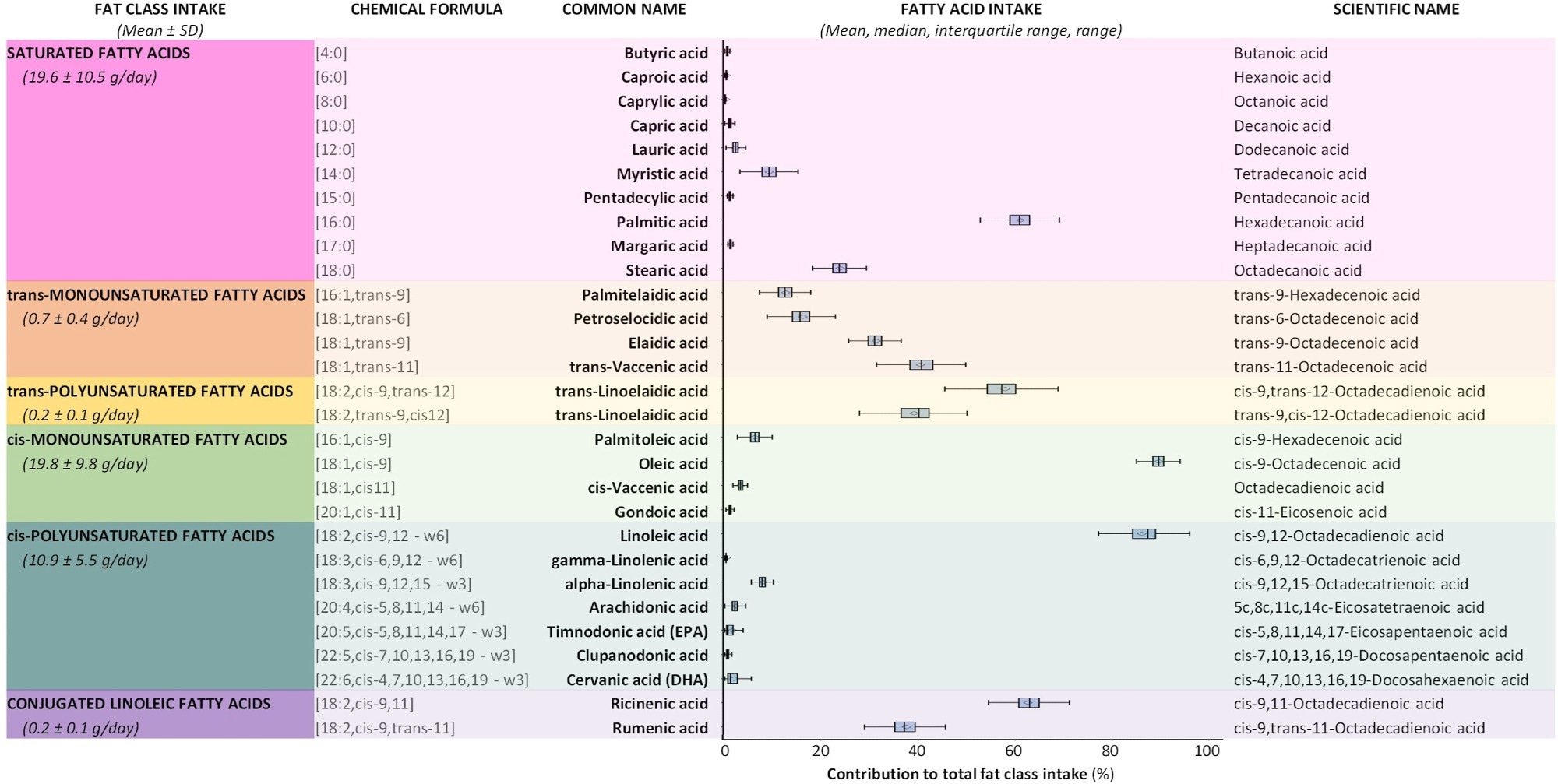 Baseline estimated daily intake of fat classes (represented as absolute intake in grams per day) and individual FAs (represented as percentage contribution to total fat class intake) n = 158,198.