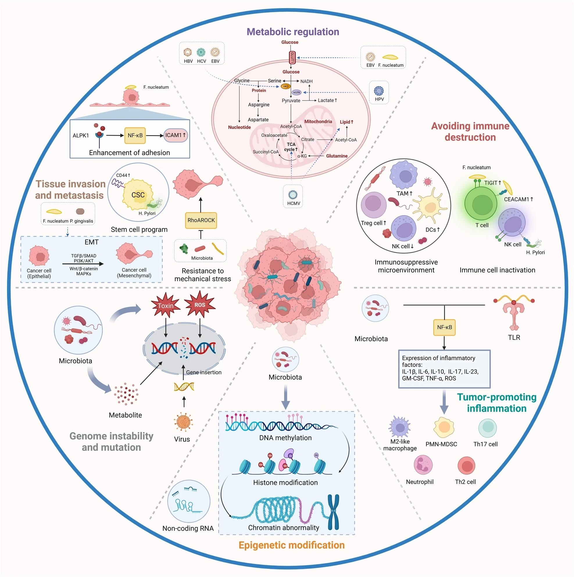 Mechanistic studies have demonstrated that tumor-resident microbes adopt six major mechanisms to influence the initiation and progression of cancer. These are genome instability and mutation, epigenetic modifications, prolonged inflammation, avoidance of immune evasion, metabolism disruption, and activation of metastasis and invasion.