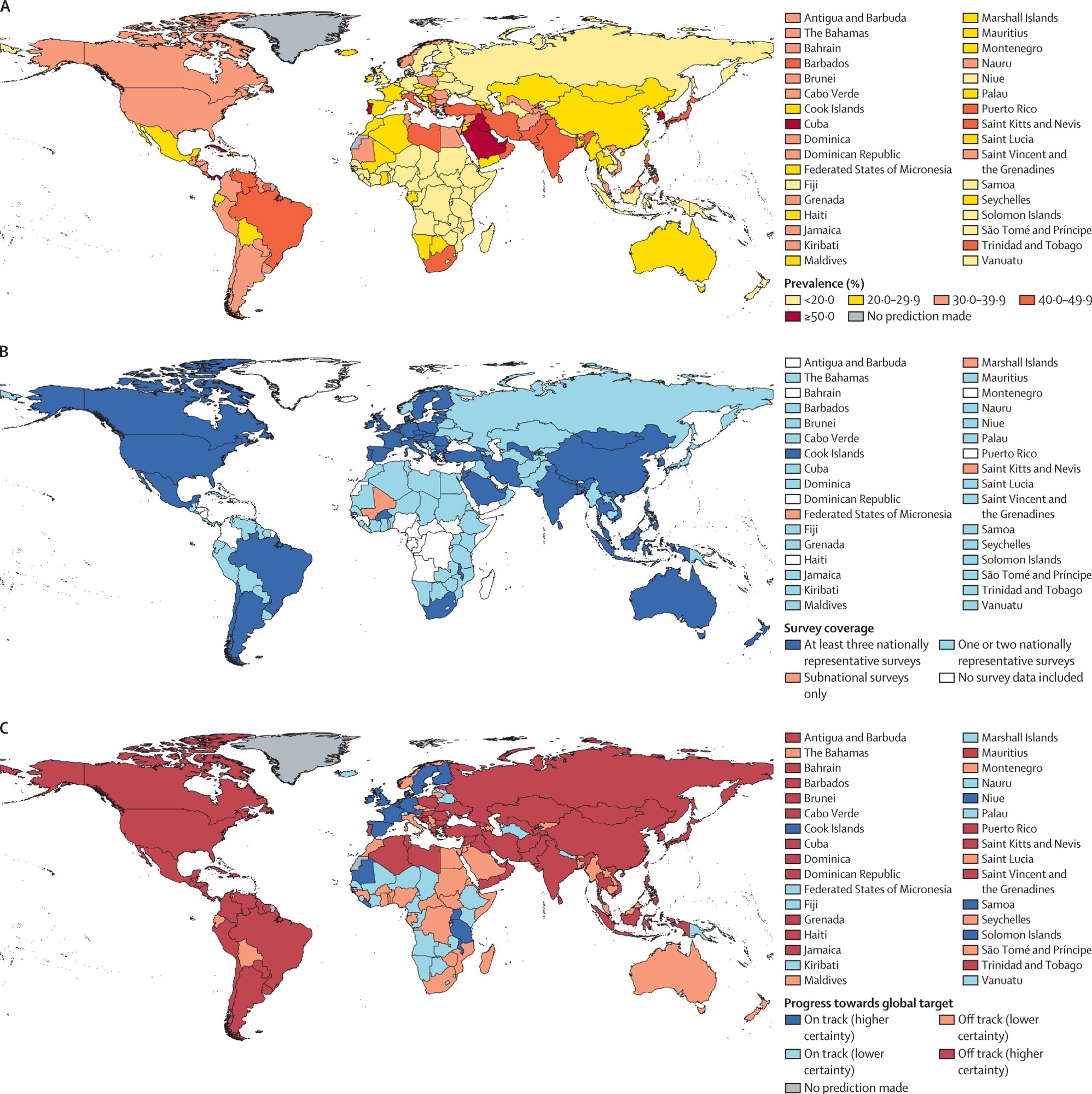 Map of (A) age-standardized prevalence of insufficient physical activity among adults aged 18 years and over in 2022, (B) data coverage and representativeness, and (C) country progress during 2010–22 toward the global target of a 15% relative reduction in insufficient physical activity prevalence among adults aged 18 years and over between 2010 and 2030. For visibility, small-area countries are listed next to a box indicating their corresponding values. Country progress towards the global target is assessed based on whether the estimated trend in insufficient physical activity during 2010–22 would be sufficient to meet the global target if trends were to continue to 2030. Higher and lower certainty indicate certainty about whether the estimated rate of change would be sufficient to meet the global target, if continued to 2030.