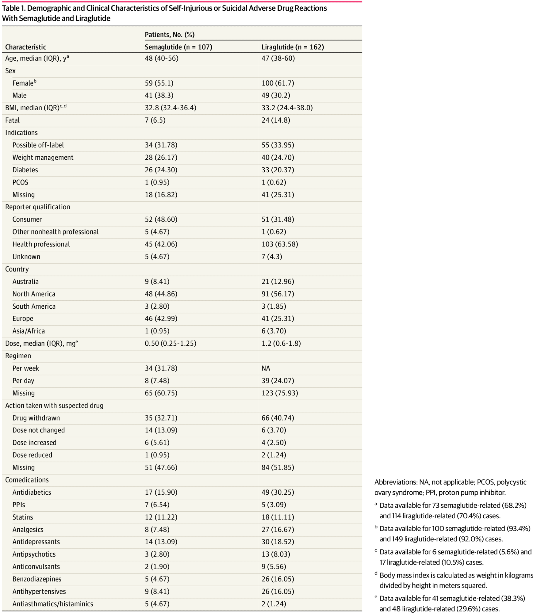 The median age was 48 and 47 years for semaglutide and liraglutide users, with female patients representing 55% and 61% of the cases, respectively. Suicidal ideation was the most prevalent ADR that was reported by 88% and 71.6% of semaglutide and liraglutide users, respectively.