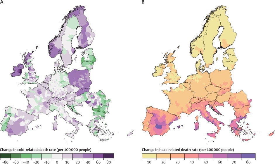 From 1991 to 2020, cold-related fatalities were 2.5-fold higher in East Europe than in West Europe, while heat-related deaths were six-fold higher in South Europe compared to North Europe. The analysis revealed that socioeconomic factors, such as regional GDP per capita, significantly influence these disparities. There were 363,809 cold-related fatalities and 43,729 heat-related fatalities for an 8.3:1 cold-to-heat mortality ratio, with considerable regional differences ranging from 3.3:1 in Slovenia to 132.5:1 in Ireland. Temperature-related fatalities would increase by 41,850 to 96,072 per year depending on the warming scenario, driven by rising temperatures, an aging population, and widening regional inequities.