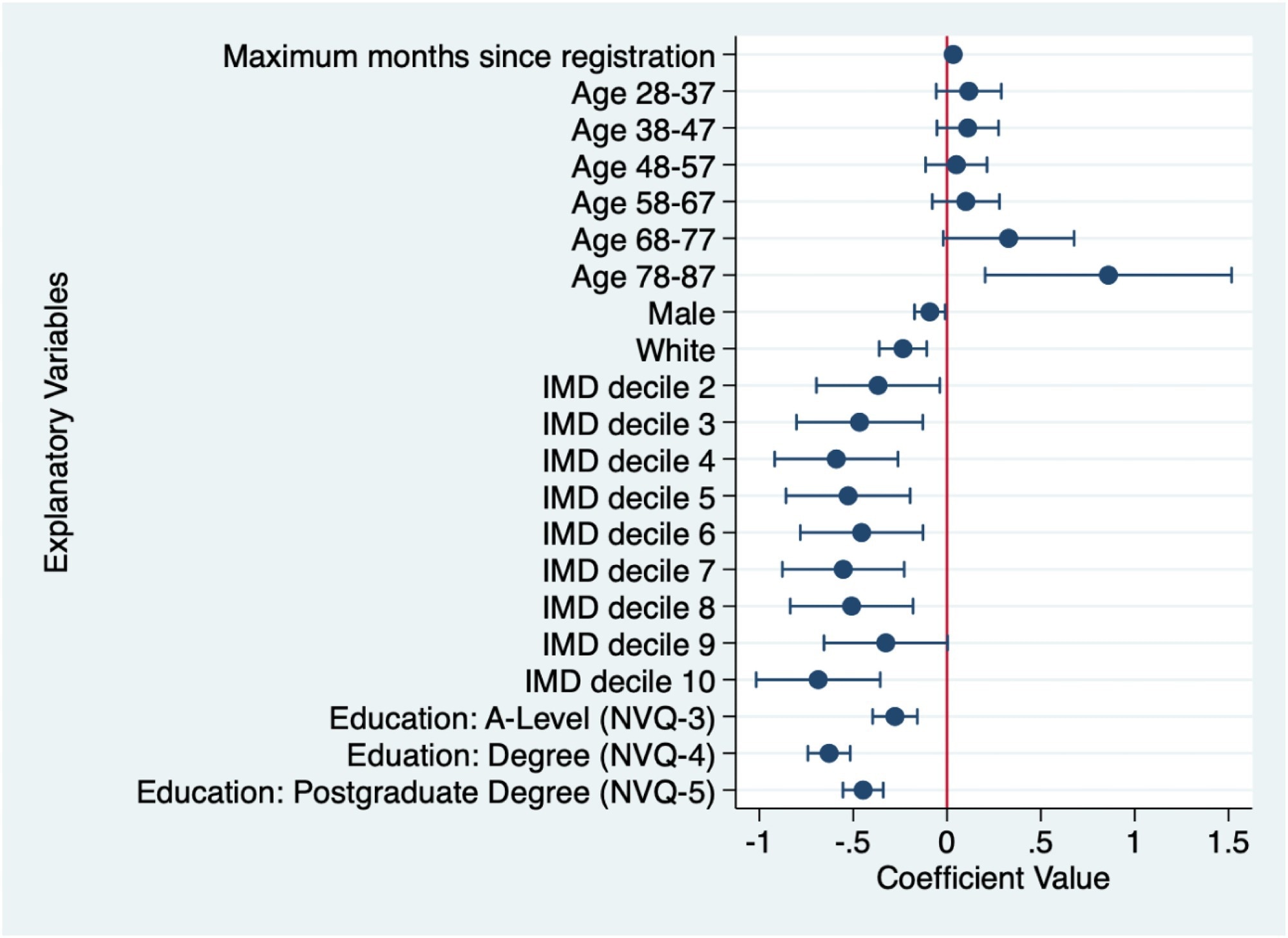Multiple linear regression analysis was used to explore the relationship between symptom intensity and factors such as time since registration, age, ethnicity, education, gender, and socioeconomic status through indices of multiple deprivation (IMD) on a scale of one to 10.