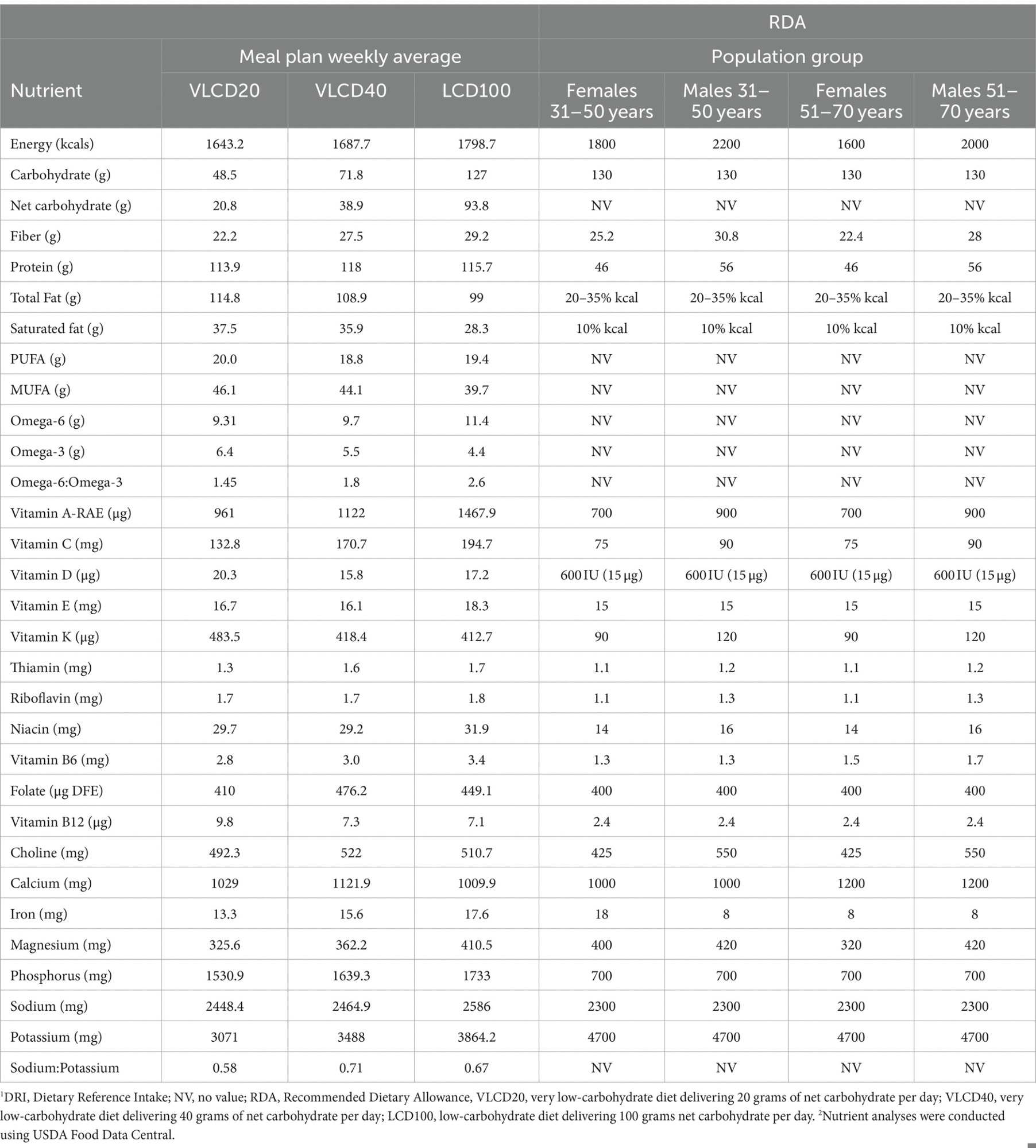 In both males and females aged 31 – 70, VLCD20, VLCD40, and LCD100 provided 37, 55, and 98% of the RDA for dietary carbohydrates, respectively. In females aged 31 – 70, VLCD40 and LCD100 provided 9 and 16% higher dietary fiber than the RDA, respectively. However, VLCD20 could not meet the RDA for dietary fiber in this age group.