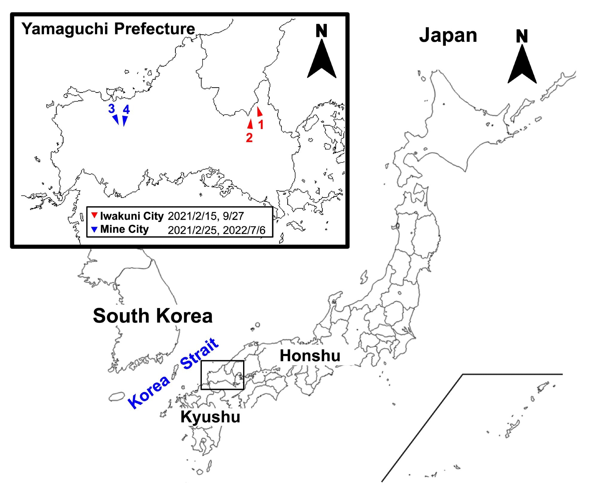 The present study comprised a year-long (2021-22) intensive investigation of DNA and RNA viruses inhabiting Japanese bats (n = 132, 4 species) from four locations within the Yamaguchi prefecture, Japan. Bats were captured in nets, and morphological examinations were conducted to classify individuals as Miniopterus fuliginosus, Myotis macrodactylus, Rhinolophus ferrumequinum, or Rhinolophus cornutus.