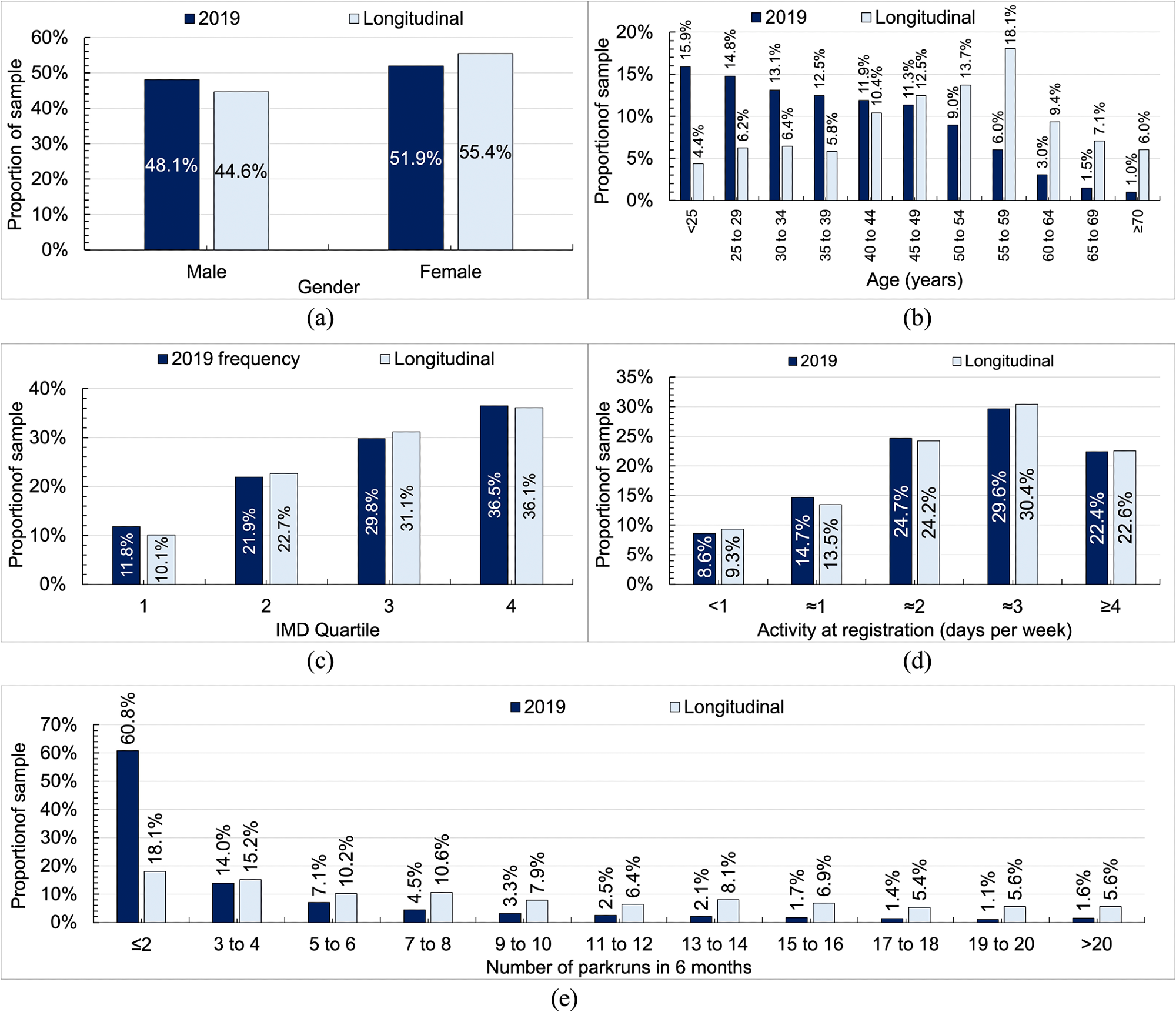 Unweighted demographics of the sample compared to the 2019 parkrun population: (a) gender; (b) age; (c) index of multiple deprivation quartile of home postcode; (d) activity at registration in days per week over the last four weeks; and (e) number of parkruns completed by 6 months. The sample was weighted to match the 2019 park run population, adjusting for differences in age, activity levels, and other demographics.