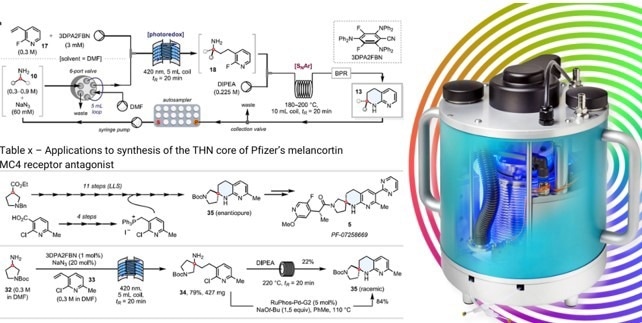 In summary, the researchers have developed an automated, continuous flow synthesis of α-alkylated and spirocyclic 1,2,3,4-tetrahydro-1,8-naphthyridines (“1,8-THNs”), in addition to their regioisomeric 1,6-THN analogues, from abundant primary amine feedstocks. The key step in this work was the photocatalysed HAA reaction step which utilizes the unique design of the Uniqsis PhotoSyn photochemical reactor from Asynt, engaging both the high power and low temperatures which were essential for the success of the reaction.