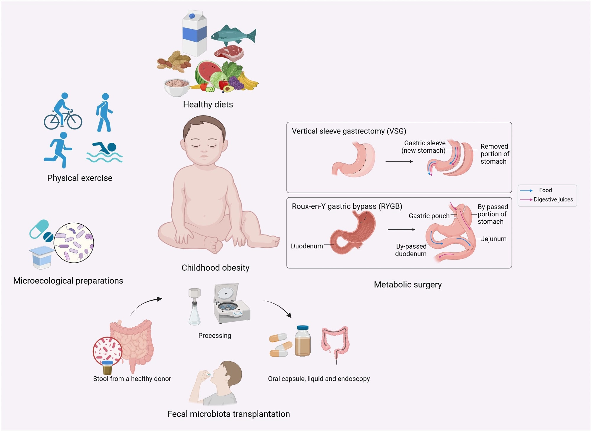 Treatment of childhood obesity from the perspective of gut microbiota. Healthy diets and regular physical exercise can reduce fat accumulation and enhance gut microbial diversity. Moreover, using microecologic preparations such as probiotics, prebiotics, and symbiotics plays a significant role in ameliorating childhood obesity by restoring the gut microbiome and improving metabolic dysregulation. Fecal microbiota transplantation refers to administering bacterial fluids containing fecal extracts from healthy donors into the recipients’ intestines through oral capsules, nasal feeding, or endoscopy to alter chronic low-grade inflammatory responses and establish an optimal ratio of gut microbiota. Moreover, metabolic surgery is acknowledged as an effective approach for the treatment of severe obesity. Currently prevalent surgical procedures encompass vertical sleeve gastrectomy (VSG) and Roux-en-Y gastric bypass (RYGB).