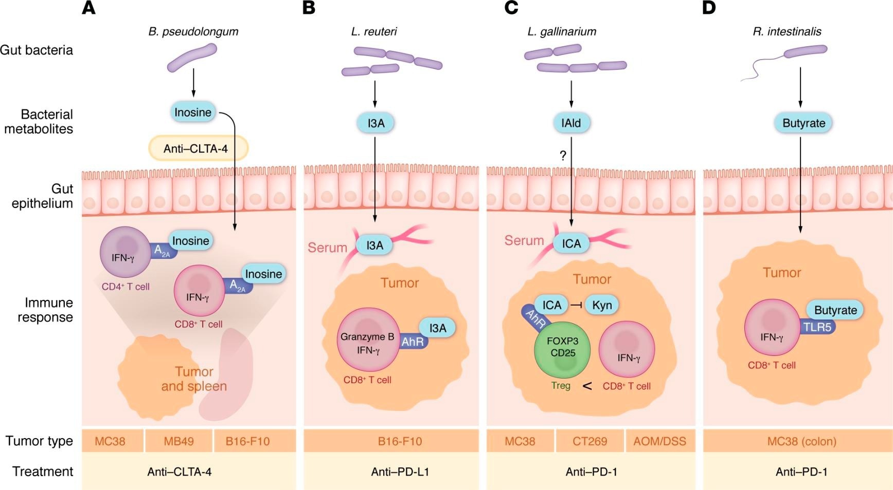 Gut bacterial metabolites that directly impact T cells in tumors. (A) B. pseudolongum releases inosine. Upon treatment with anti–CTLA-4, inosine enters the bloodstream and signals through the adenosine receptor (A2A) to increase IFN-γ+CD4+ and CD8+ T cells to promote response to anti–CTLA-4. (B) L. reuteri releases indole-3-aldehyde (I3A), which enters the bloodstream and signals through the aryl hydrocarbon receptor (AhR) to promote tumor-infiltrating GZMB+ and IFN-γ+CD8+ T cells and increase response to anti–PD-L1 treatment. L. reuteri also appears to translocate to the tumor to promote antitumor immunity, though how it translocates to the tumor without inducing an infection response is unknown. (C) L. gallinarium produces indole-3-carboxaldehyde, which gets converted in the serum to indole-3-carboxylic acid (ICA), which blocks kynurenine (Kyn) signaling through the AhR receptor. This decreases the amount of tumor-infiltrating Tregs, resulting in more IFN-γ+CD8+ T cells in the tumors; this in turn promotes antitumor responses to anti–PD-1 therapy in tumors implanted subcutaneously and in tumors arising in the gut by AOM/DSS-induced colitis. (D) In tumors in the colon, R. intestinalis releases butyrate that signals through TLR5 to induce IFN-γ+CD8+ T and increases response to anti–PD-1 treatment. Whether this mechanism works in tumors outside of the gut remains unclear.