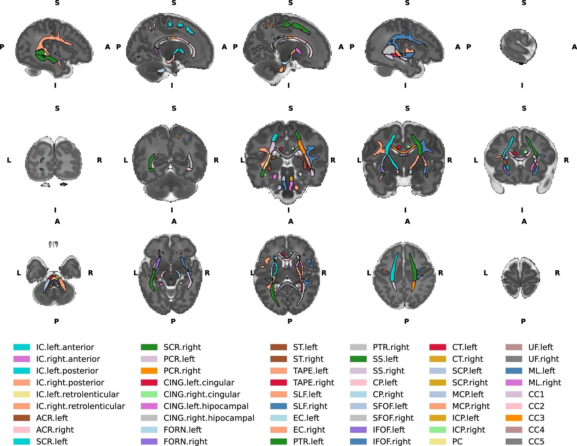 Top row - Left to right sagittal view of the brain slices. Middle row- Posterior to anterior coronal view of the brain slices. Bottom row - Inferior to superior axial view of the brain slices. IC internal capsule, ACR anterior corona radiata, SCR superior corona radiata, PCR posterior corona radiata, CING cingulum, FORN fornix, ST stria terminalis, SLF superior longitudinal fasciculus, EC external capsule, PTR posterior thalamic radiation, SS sagittal stratum, CP cerebral peduncle, SFOF superior fronto-occipital fasciculus, IFOF inferior fronto occipital fasciculus, CT corticospinal tract, SCP superior cerebellar peduncle, MCP middle cerebellar peduncle, ICP inferior cerebellar peduncle, PC pontine crossing, UF uncinate fasciculus, ML medial lemniscus, CC1 corpus callosum prefrontal part, CC2 premotor/supplementary motor part, CC3 corpus callosum motor part, CC4 corpus callosum sensory part, CC5 corpus callosum parietal/temporal/occipital part. L- left, R- right, A- anterior, P- posterior, S- superior, I- inferior.