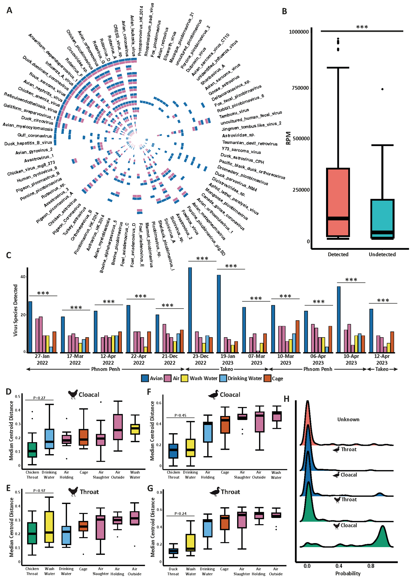Environmental metagenomics accurately detects circulating poultry pathogens. A) Circular heatmap depicts virus detection between poultry swabs and the environment. Whereby a given virus was found in at least poultry sample a blue cell is shown and whereby that same virus was found in at least one environmental sample at the same time and location an adjacent pink cell is shown. Each track of the heatmap represents one visit to an LBM. B) Boxplot showing the difference in virus abundance between taxa that were successfully detected or undetected from panel A. Statistics were calculated using a Wilcox test. C) Bar plot showing the total number of unique viruses detected in poultry swabs compared to each individual environmental sample at each sampling date. Statistics were calculated using Fishers exact test best all groups. Based on PCoA in Supplementary Figure 5, we calculated the distance of all samples from the median centroid coordinates of D) cloacal and E) oropharyngeal swabs obtained from domestic chickens as well as F) cloacal and G) throat swabs obtained from domestic ducks. Statistics were calculated using a Kruskall-Wallis with Dunns post-hoc test. H) Ridge plot showing the probability of each poultry swab being the source of pathogenic viruses for all environmental samples. Statistics were calculated using a Kruskall-Wallis with Dunns post-hoc test. All P-values obtained were corrected for false-discovery rate (FDR) using the Benjamini-Hochberg method. P values are annotated as follows: P < 0.05 ; P < 0.01 ; P < 0.001.