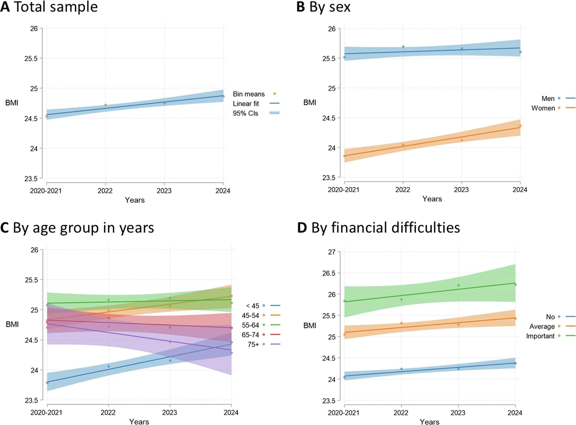 Trends in BMI over time for the total study sample, and by sex, age group, and financial difficulties (N = 7388).