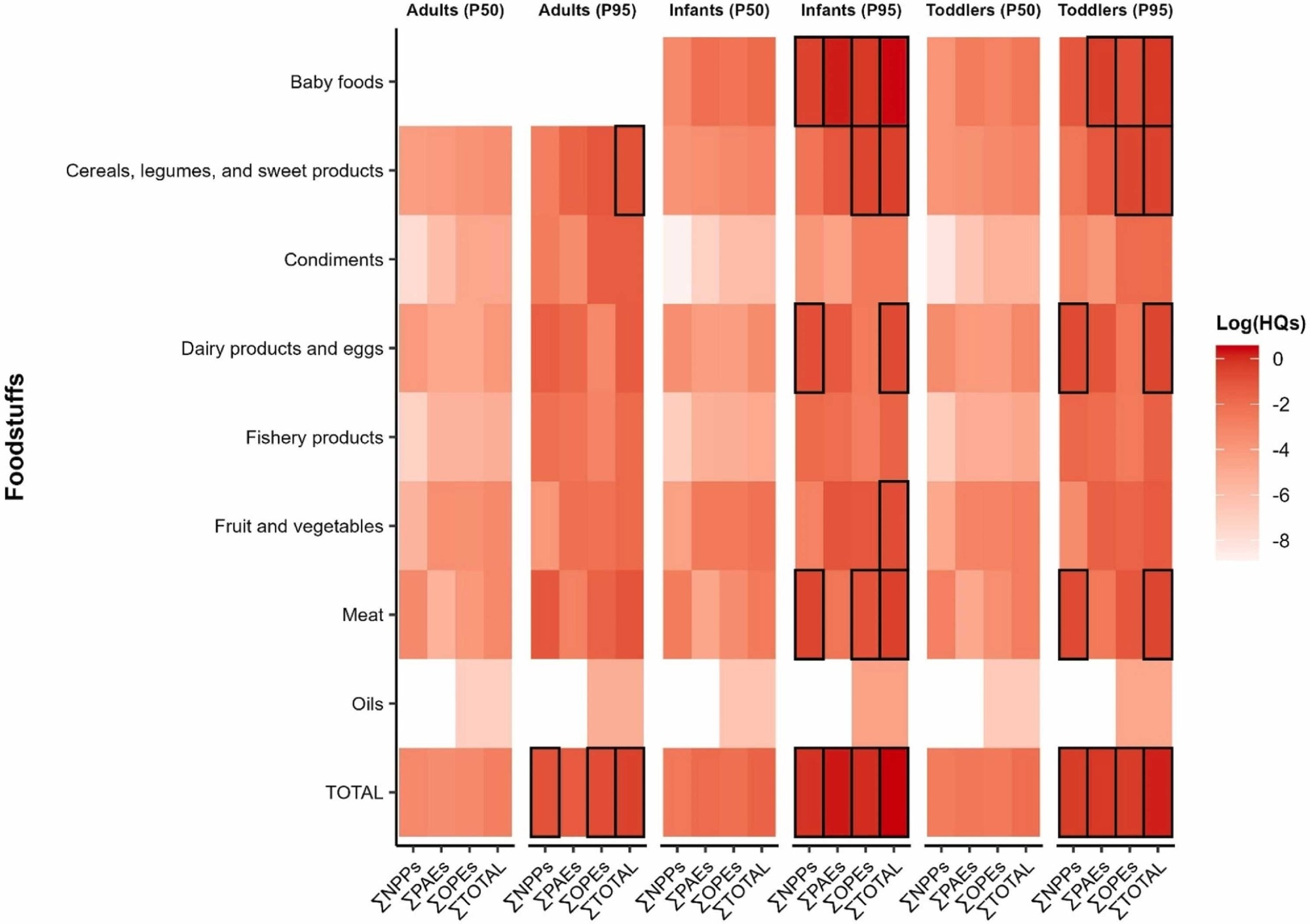 Heat map of HQs in selected population groups, normalized on a logarithmic scale, considering median (P50) and 95th percentile (P95) scenarios (highlighted boxes indicate HQ values greater than 10-1).
