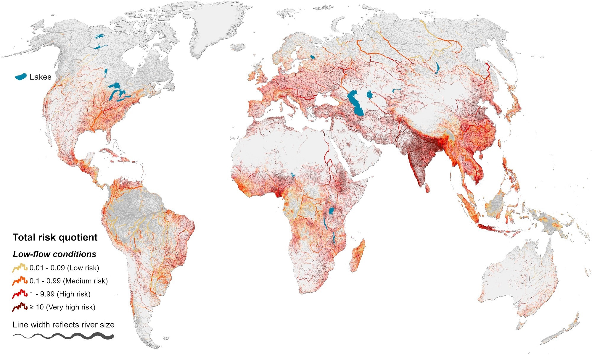 Environmental exposure levels of antibiotics in global rivers. Total risk quotient (RQtot) is calculated as the sum of individual risk quotients of all 40 antibiotics in the global river system under low-flow conditions. Rivers in gray present insignificant risk (RQtot < 0.01). Only rivers exceeding a long-term average flow of 0.1 m3 s−1 are shown.