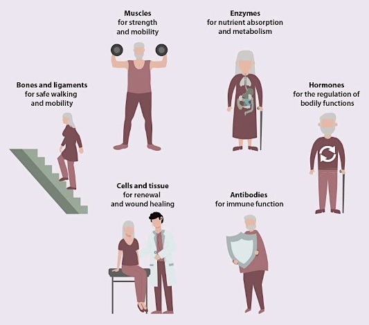 "Healthy Aging", Illustrating the importance of proteins in various functions. Image Credit: Karger Publishers