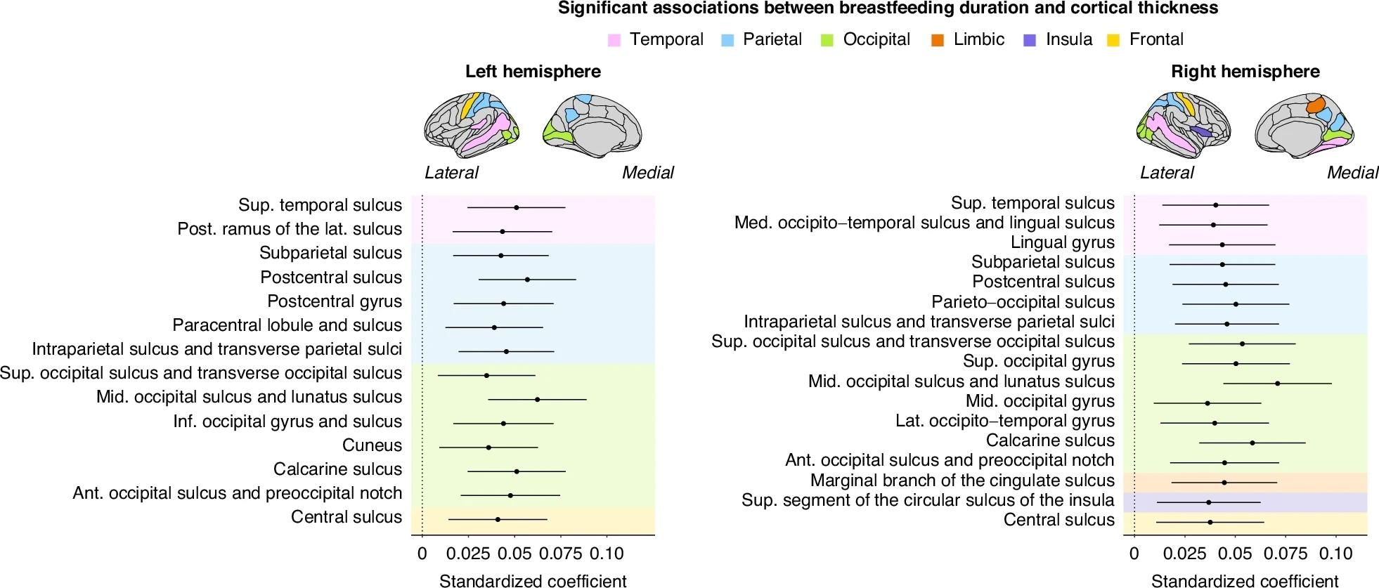Breastfeeding duration analyses revealed that longer breastfeeding periods were associated with increased cortical thickness and surface area across 31 and 45 regions, respectively (out of 148). Cortical structure is hypothesized to protect against age-related cognitive decline, and the extent of surface area increase was observed to mediate associations between breastfeeding duration and fluid cognition, highlighting the importance and interplay between these variables.