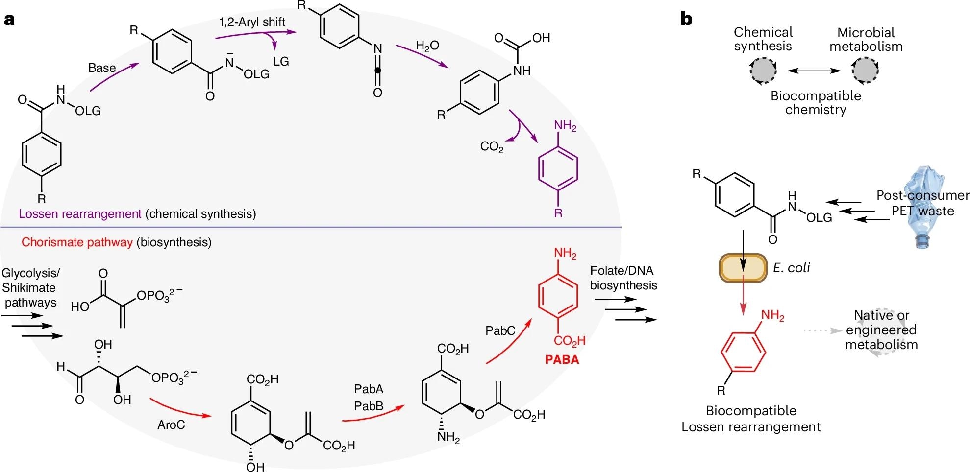 a, A comparison of strategies for C–N bond formation via Lossen rearrangement in synthetic organic chemistry or via chorismate pathways in cellular metabolism. b, The proposed merging of non-enzymatic Lossen rearrangement chemistry with cellular metabolism for sustainable synthesis and the bio-upcycling of plastic waste. LG, leaving group.
