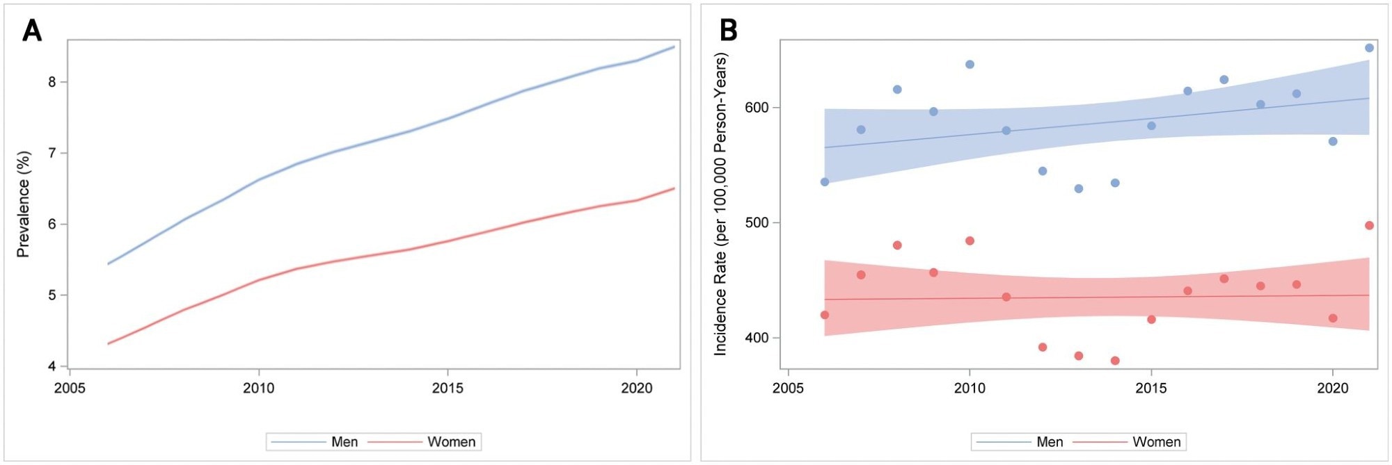 (A) Age-standardized prevalence (%) of type 2 diabetes in Sweden 2006–2021 by sex. The shaded areas represent 95% confidence intervals. (B) Age-standardized incidence (per 100000 person-years) of type 2 diabetes in Sweden 2006–2021 by sex. The shaded areas represent 95% confidence intervals.