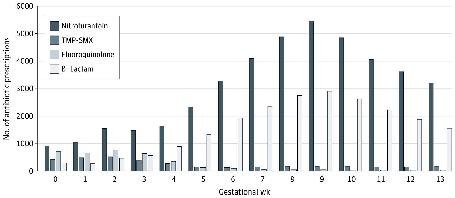 The median (IQR) gestational age at index for symptomatic UTI was 6 (3-9) weeks compared with 9 (7-11) weeks for asymptomatic bacteriuria. TMP-SMX indicates trimethoprim-sulfamethoxazole.