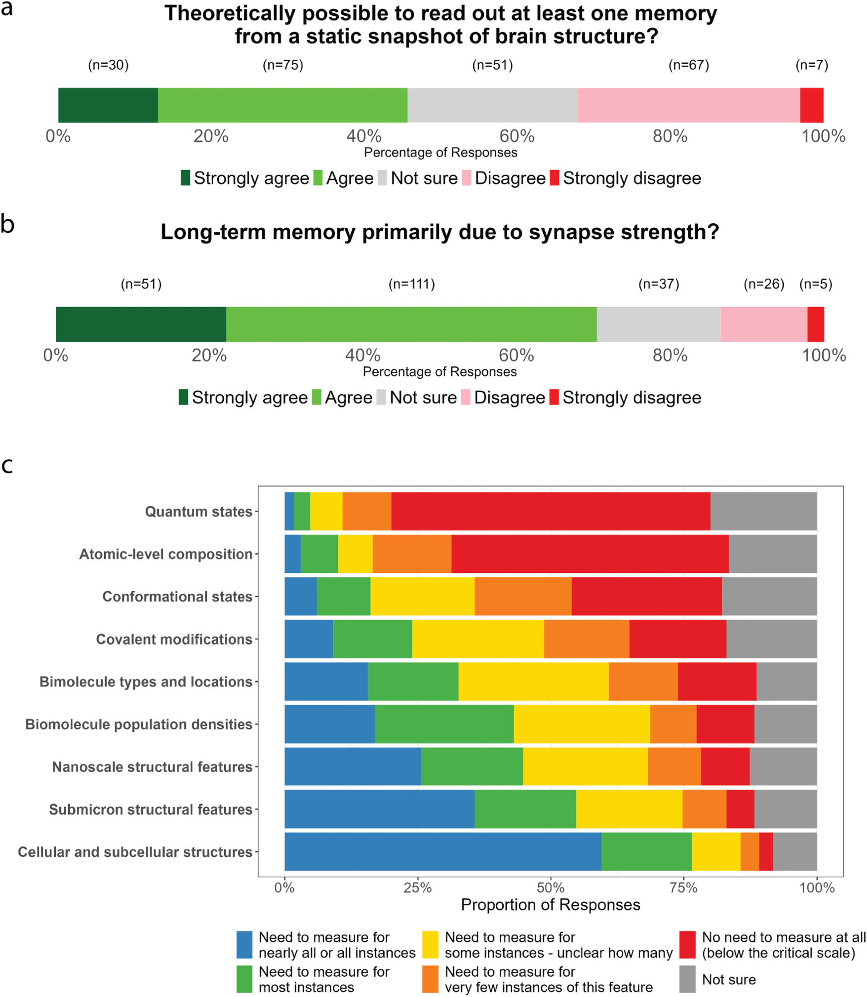 Beliefs about the physical basis of memory. a) Responses to the question ‘To what extent do you agree with the following statement: “Given the scientific knowledge assumed in Point A existed, it would be theoretically possible to read out the information corresponding to at least one specific non-trivial memory from a static snapshot of the structure (including biomolecules) of an organism's entire brain.” b) Responses to the question ‘Some neuroscientists have suggested that, while molecular and subcellular details play a role, the majority of information for long-term memories is likely physically stored in the brain at the level of neuronal connectivity patterns and ensembles of synaptic strengths (e.g., Poo et al., 2016). To what extent do you agree with the following statement: “The structural basis of long-term memories primarily consists of lasting changes in neuronal connectivity and ensembles of synaptic strengths, rather than in molecular or subcellular details.” c) Participants’ views on the critical scale for memory encoding in the brain.