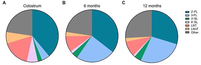![Relative abundance of the six core HMOs in breast milk between 0 and 12 months of age. Ratios of the six individual HMOs were calculated in relation to total HMO concentration. Ratios were calculated by taking the quotient of average individual HMO levels divided by average total HMO level at the respective timepoint and multiplying by 100%. “Other” was calculated as 100% - [Sum % of 2′-FL, 3-FL,3′-SL, 6′-SL, LNT, LNnT]. (A) Colostrum, (B) 6 months, (C) 12 months.](https://appetitescience.com/images/news/ImageForNews_818597_1757378468615770.jpg)