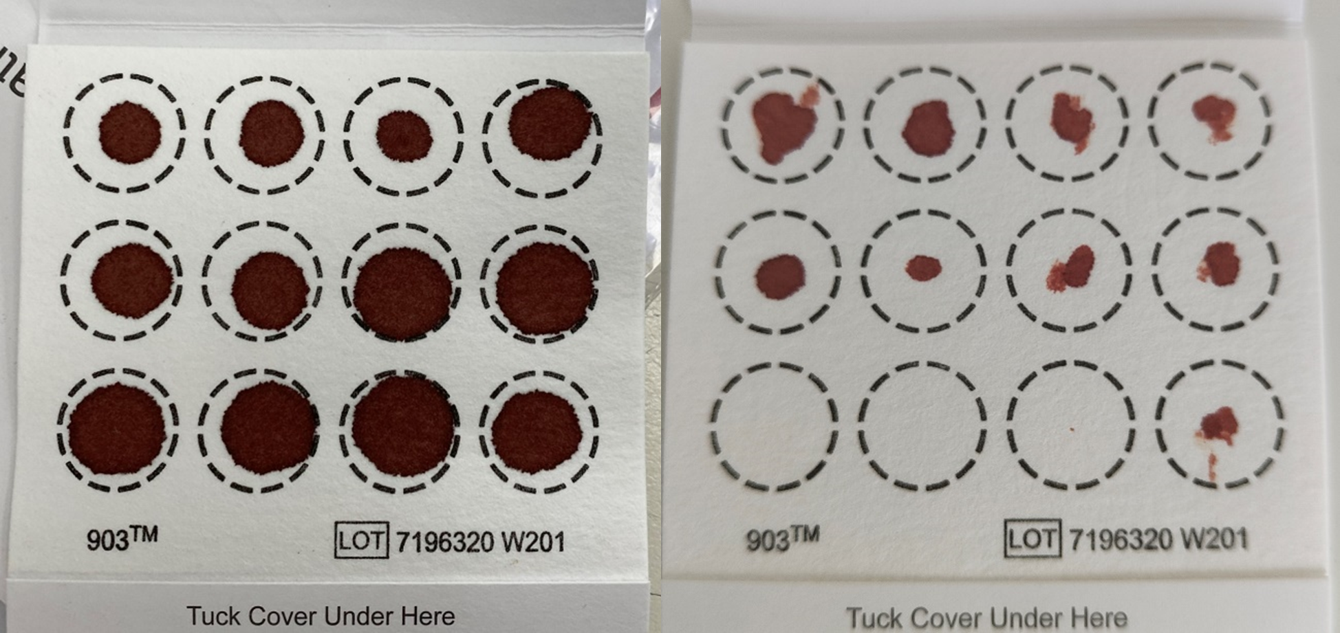 Participant dried blood spot card collection examples of A) a ‘good quality’ sample that was adequate for analysis of all eight cardiometabolic profile markers and B) a ‘poor quality’ sample that was adequate for analysis of only two cardiometabolic profile markers.