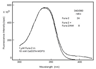 The AM form, which is insensitive to calcium, will not undergo a wavelength shift like the sensitive form. Figure 1 shows the effect of residual unhydrolyzed dye on the 340/380nm ratio.