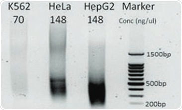 Chromatin was prepared from three cell lines, K562 (ATCC Ref# CCL-243), HeLa (ATCC Ref# CCL-2), and HepG2 (ATCC Ref# HB-8065), as per the Chromatrap® protocol. Each cell line was cultured in fresh media as stipulated by ATCC. Using the Chromatrap® specific lysis buffer, cells were lysed and chromatin was obtained as standard. This chromatin was sonicated to create chromatin fragments in the region of 100-600 base pairs (Figure 2).
