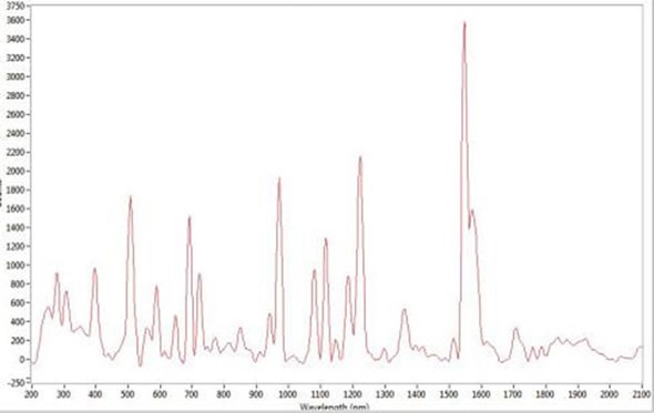 An acetaminophen tablet was the first pharmaceutical to be examined. The tablet was cut in half and the centre was analyzed as the exterior did not contain any active ingredients. The integration time was 5 seconds and 2 scans were averaged (Figure 2).