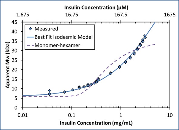 The above results clearly show that CG-MALS is capable of measuring the isodesmic self-assembly of human insulin at neutral pH in the absence of zinc. Although the overall Mw only increased by 6 times across the concentrations analyzed (~0.3-3 mg/mL, ~5-500 µM), the Mw change as a function of concentration is not defined by simple monomer-hexamer equilibrium. Instead, a more accurate picture of the complexes present at equilibrium includes higher order insulin oligomerization, with species that contain >10-mer under these conditions.