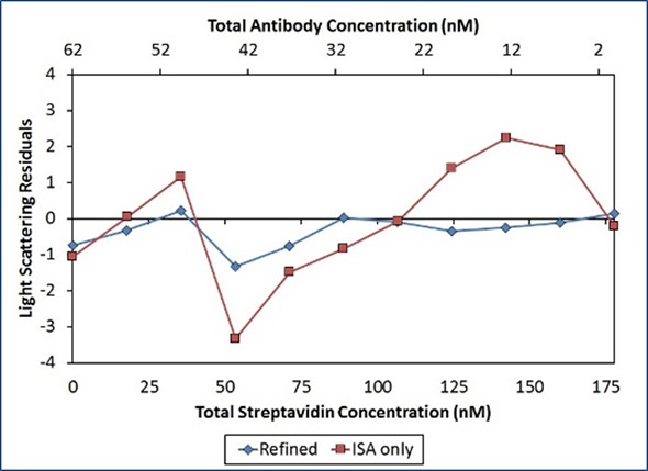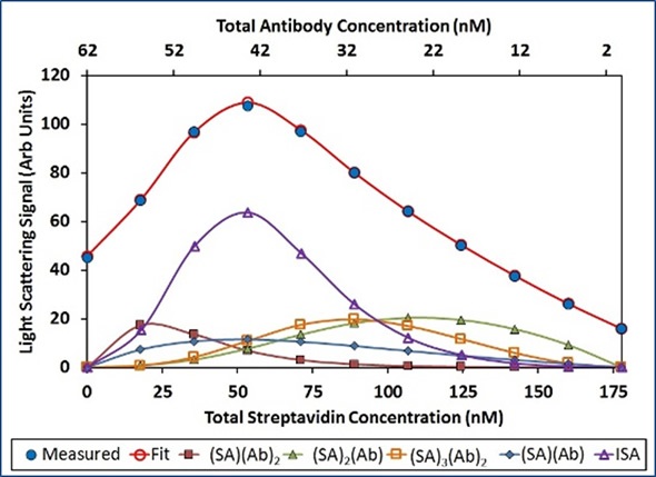 In Figure 5, the best fit (red unfilled circles) for the measured light scattering data (blue filled circles) shows contributions from ISA, (SA) (Ab), and (SA)(Ab)2 species. The purple squares show the overall contribution to the model by all species with stoichiometry [(SA)(Ab)]n with n>1.