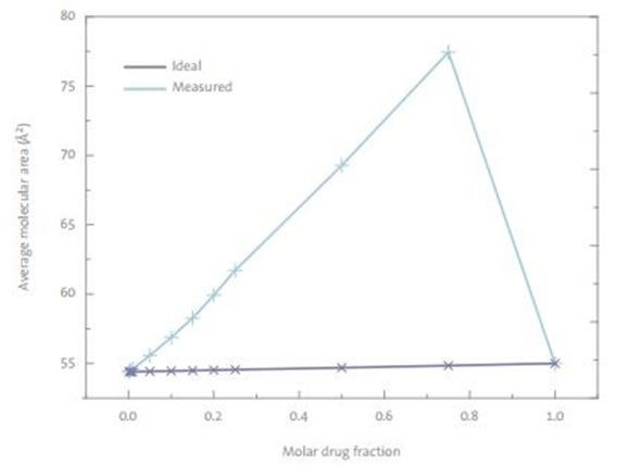 Even small quantities of the drug were found to react with DPPC monolayers. The isotherm data (Figure 3) suggests a repulsive behavior between the drug and DPPC at all concentrations, with the relative excess area being positive for the drug. Drug concentrations as small as 0.1 mol% led to changes in the isotherm, showing that even DPPC that was not close to the drug, was affected. These phenomena are described as repulsive cooperative interactions. Even at large surface pressures of 30mN/m, the drug was not expelled from the monolayer.