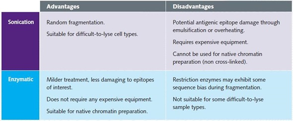 Enzymatic shearing is necessary when performing native ChIP because sonication can disrupt the protein/DNA complexes. Table 1 shows the pros and cons of shearing optimization using enzymatic digestion and sonication.