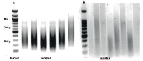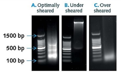 After optimal sonication conditions, uniform chromatin fragments of 100 to 500 bps in length should be visualized using agarose gel electrophoresis (A). Poor sonication will give rise to differing fragment lengths and diffuse smears, with samples displaying fragment sizes between 100 and 1000 bp (B). Under digestion will result in fragment lengths above 500bps in size (B), while over digestion will lead to complete fragmentation to 200 bp (C), as shown in Figure 2.