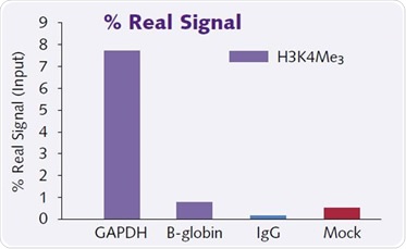 Figure 3 shows little to no enrichment for H3k4Me3 on to the negative target gene B-globin. Also shown are IgG and a no antibody (mock) control with 0.15 and 0.38% real signal. This demonstrates the sensitivity and specificity of the Chromatrap® ChIP assay.