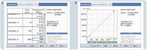 Figure 8. Generation of a standard curve using the PicoGreen “short” method A: Table format display / B: Graphic format display.