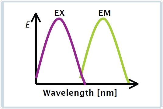 Figure 3. The light for excitation (EX) of the fluorophore has a shorter wavelength than the fluorescent light emitted (EM).