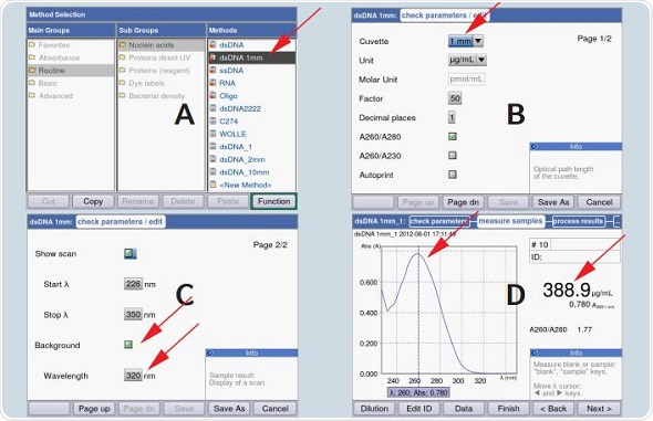 Figure 3. Parameter selection on the BioSpectrometer for application of the 1mm light path and for activation of background correction: A) Selection of method dsDNA_1mm B) Select optical path length to 1mm (only required if dsDNA_1mm is not employed) C) If desired, you may activate the scan display and/or background correction D) Example of a measurement of a dsDNA-solution using the µCuvette in the BioSpectrometer