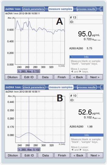 Obtaining proper results is not possible when a sample column is not formed, which is shown in Figure 7A. However, when a proper liquid column is formed, appropriate results may be expected. This is shown in Figure 7B. Identical dsDNA samples were measured in both the cases. Figure 7 depicts the absorbance spectrum of a dsDNA solution. The 260/280 ratio and the sample concentration were easily measured. In case of the scenario shown in Figure 7A, neither of these measurements could be derived because the liquid column was not formed.