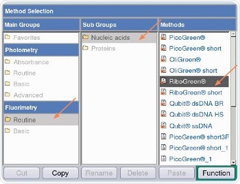 Figure 5 shows that RiboGreen method is chosen for measurements through the following path: Fluorimetry/Routine/Nucleic acids/RiboGreen. Both quadratic and linear regressions are followed for analyzing the RNA samples, as shown in Table 2.