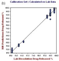 The R2 and the standard error of calibration (SEC) values for the resulting model for 1 hour were 0.9972 and 0.3165, respectively. The standard error of prediction (SEP) for the selected samples was found to be 0.416, with 0.4221 as standard error of cross validation (SECV), good predictability was demonstrated by the one-left-out cross validation. The plot of the NIR predicted percent drug (propranolol) released against the actual drug dissolution results for the hour 1.0 calibration set is depicted in the left hand plot of Figure 4.