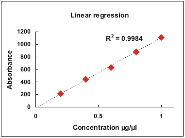 The common principle in colorimetric methods of detection is that the enzyme activity or concentration of an unknown sample is assessed by a calibration curve. The creation of such a curve involves successive measurement of various known standards by a spectrophotometer. This is followed by regression analysis. The generated calibration curves are either linear (Figure 3) or non-linear (Figure 4).